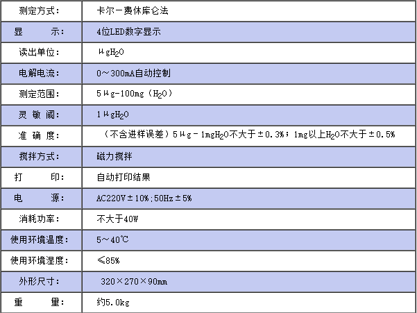 儀器符合GB/T7600;SH/T0246;GB/T606及采用卡爾—費休法測定樣品中水分的有關標準。儀器采用了先進的自動控制電路,電解電流自動跟蹤控制,外型結構新穎,從而使該儀器工作更可靠, 使用更方便,具有分析速度快(一分鐘出結果)、操作簡便、精度高、自動性強等特點, 同時具有自動打印功能,可將實驗結果、做樣時間、樣品編號自動打印出來, 廣泛應用于石油、化工、電力、鐵路、環保等部門。